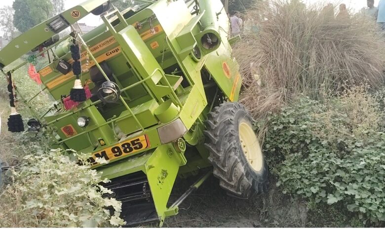 स्टेयरिंग फेल होने से बेकाबू कम्पाइन गढ्ढे में पल्टा